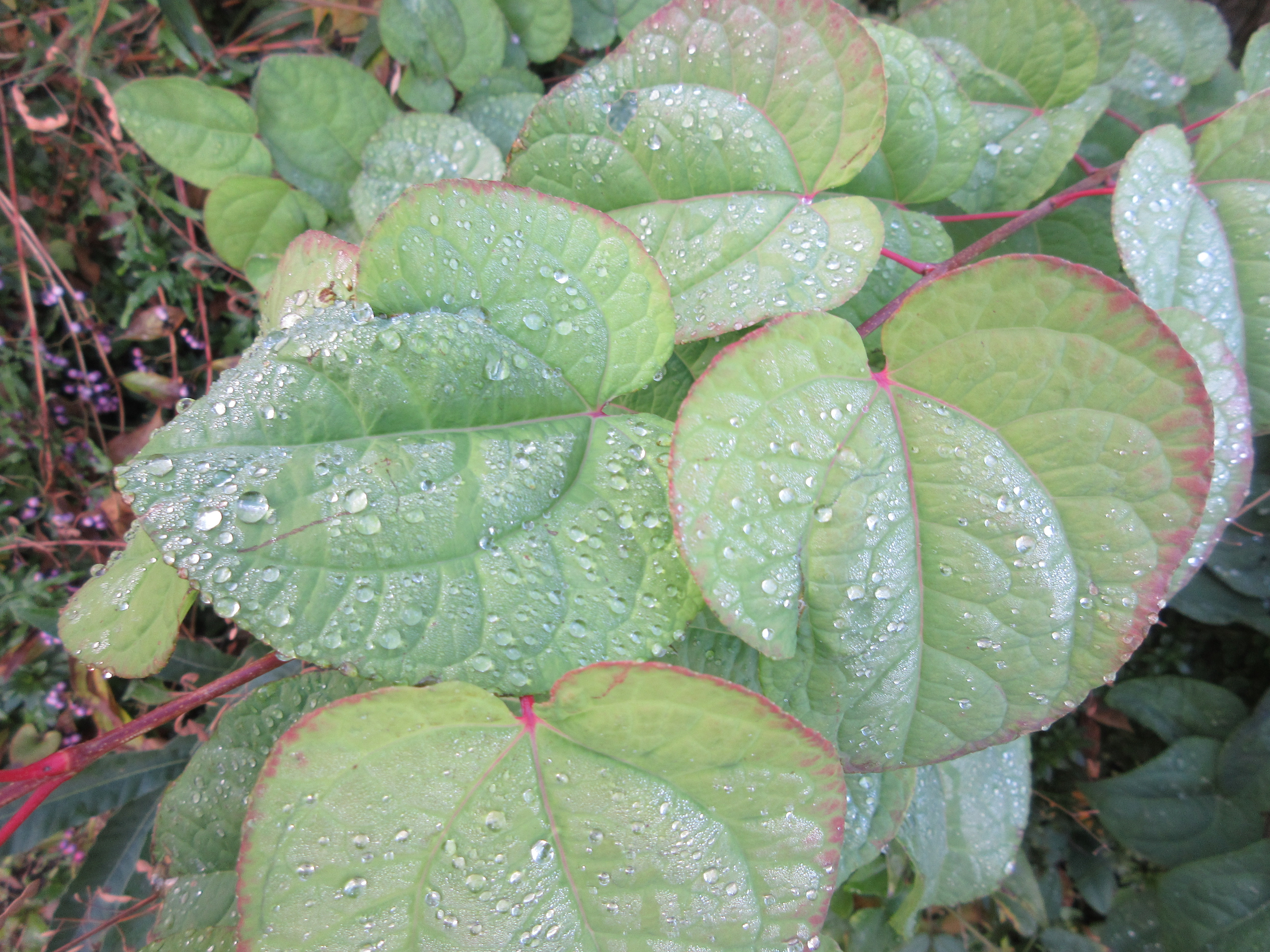 (今朝の雨に濡れた桂の葉。紅葉しないでがんばってます)